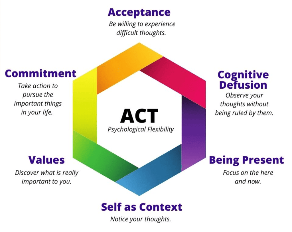 With ICW, we explore unresolved emotional wounds from early life experiences that may still be influencing your present behavior, relationships, and sense of self-worth. Through the 6 components of ACT therapy, we explore how to step back from unhelpful thoughts, reconnect with what truly matters to you, and take committed action - even in the face of fear or uncertainty.